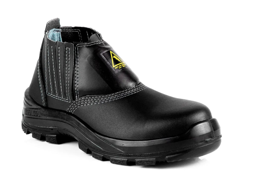 Calçado de Segurança Dielétrico (Isolante): Possui solado e cabedal que não conduzem eletricidade. São a escolha certa para quem busca um calçado de segurança para eletricista. Eles isolam o pé do chão, prevenindo a passagem de corrente elétrica pelo corpo. ATENÇÃO: Não devem ter componentes metálicos, como a biqueira de aço.